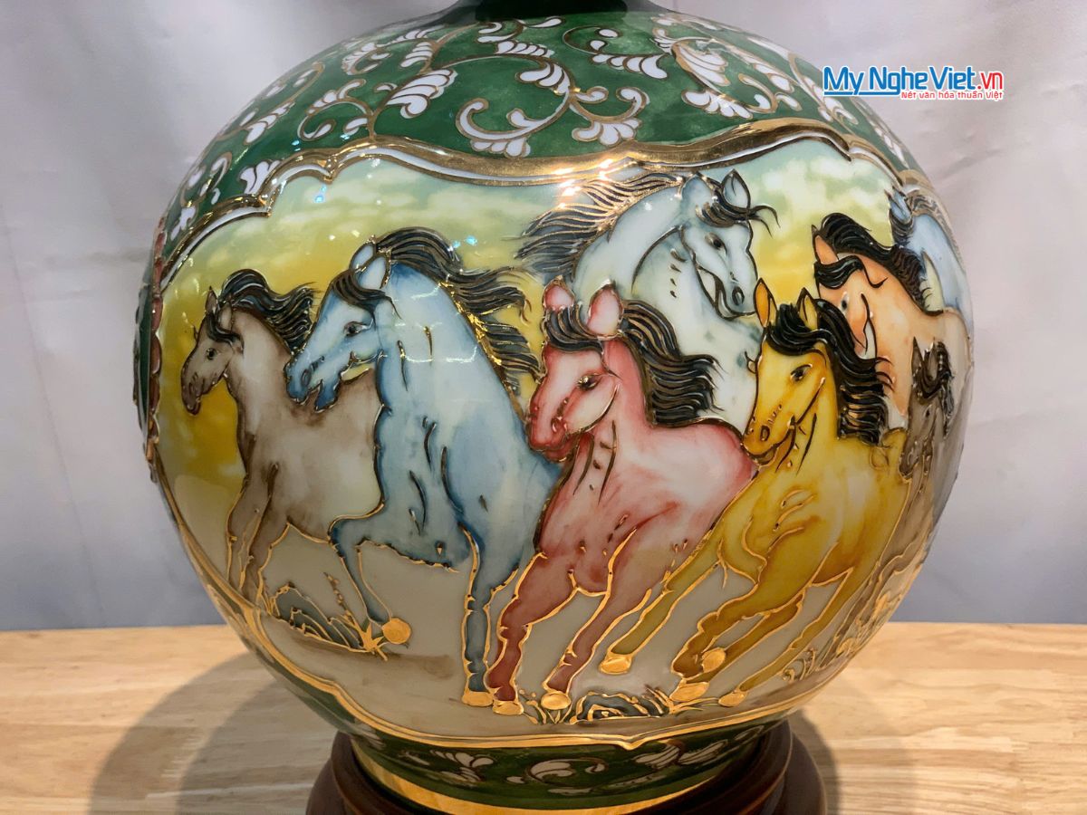 Chiếc Bình thu tài hút lộc mã đáo thành công gốm Bát Tràng bổ khung vẽ nhị cảnh đắp nổi là một tuyệt tác nghệ thuật. Kỹ thuật đắp nổi và bổ khung cho phép nghệ nhân thể hiện trọn vẹn sự sống động của hình ảnh “Mã Đáo Thành Công” (tám con ngựa dũng mãnh báo tin thắng lợi), một biểu tượng mạnh mẽ của thành công, tốc độ và sự phát triển vượt bậc trong kinh doanh. Chiếc Bình thu tài này còn được thiết kế với hình dáng miệng loe, cổ thon, bụng phình đặc trưng, tượng trưng cho việc “thu nạp vượng khí, giữ gìn tài lộc”.