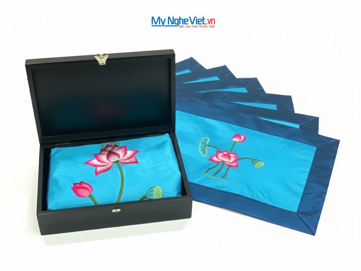 Bộ quà tặng hộp sơn mài cò đào và khăn trải bàn màu xanh dương thêu sen CBHSMHD2030/2-1 – Quà tặng sang trọng