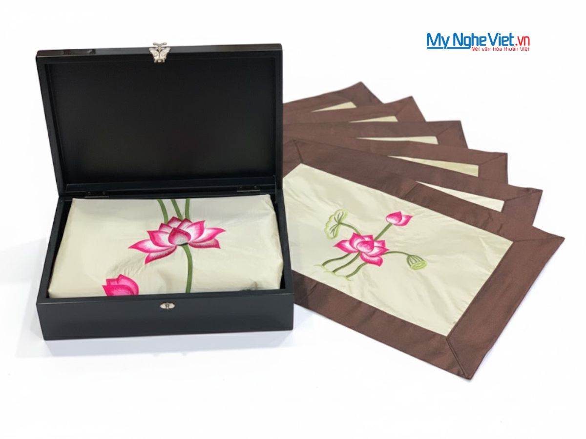 Bộ quà tặng Hộp sơn mài và bộ khăn trải bàn thêu sen là sự kết hợp hài hòa giữa vẻ đẹp truyền thống và tính ứng dụng hiện đại: