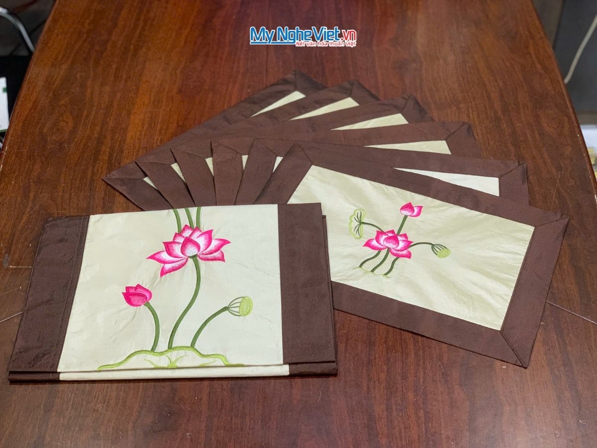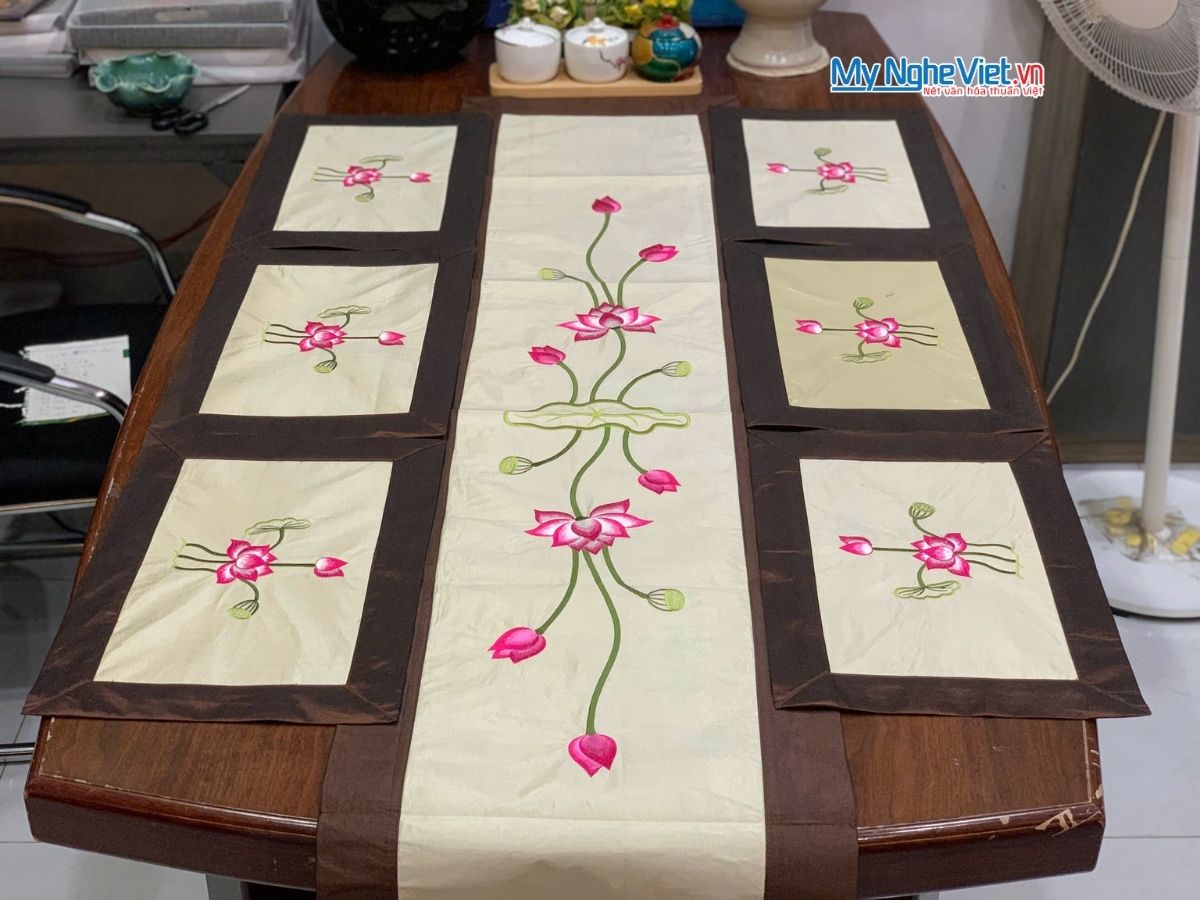 - Khăn Trải Bàn Thêu Sen: Điểm nhấn đặc biệt của bộ quà tặng là khăn trải bàn được làm từ chất liệu vải Tafta (Taffeta) cao cấp, nổi tiếng với độ đứng phom và độ bóng sang trọng. Đặc biệt, khăn được sản xuất tại Hà Đông, Hà Nội, nơi có truyền thống dệt lụa lâu đời, với họa tiết hoa sen thanh tao được thêu tay.