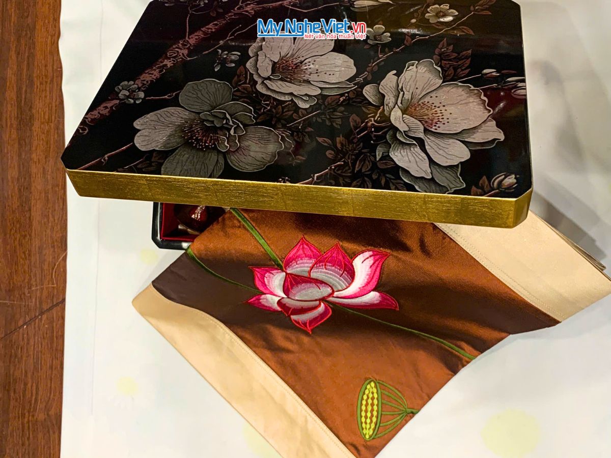 Sản phẩm Hộp sơn mài cao cấp hoa phù dung và bộ khăn trải bàn tại showroom Mỹ Nghệ Việt cùng hàng ngàn sản phẩm quà tặng khác