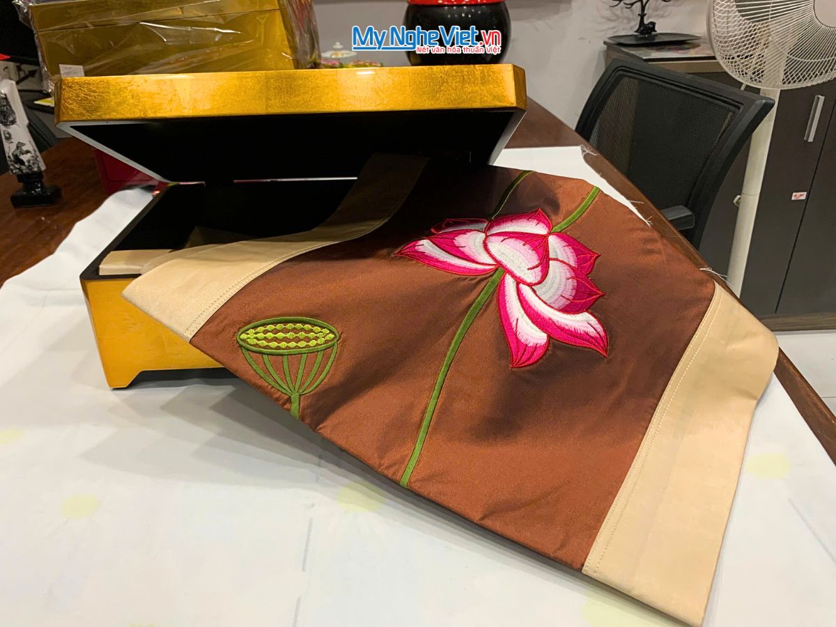 Sản phẩm Hộp sơn mài cao cấp hoa sen và bộ khăn trải bàn tại showroom Mỹ Nghệ Việt cùng hàng trăm sản phẩm lụa Hà Đông khác
