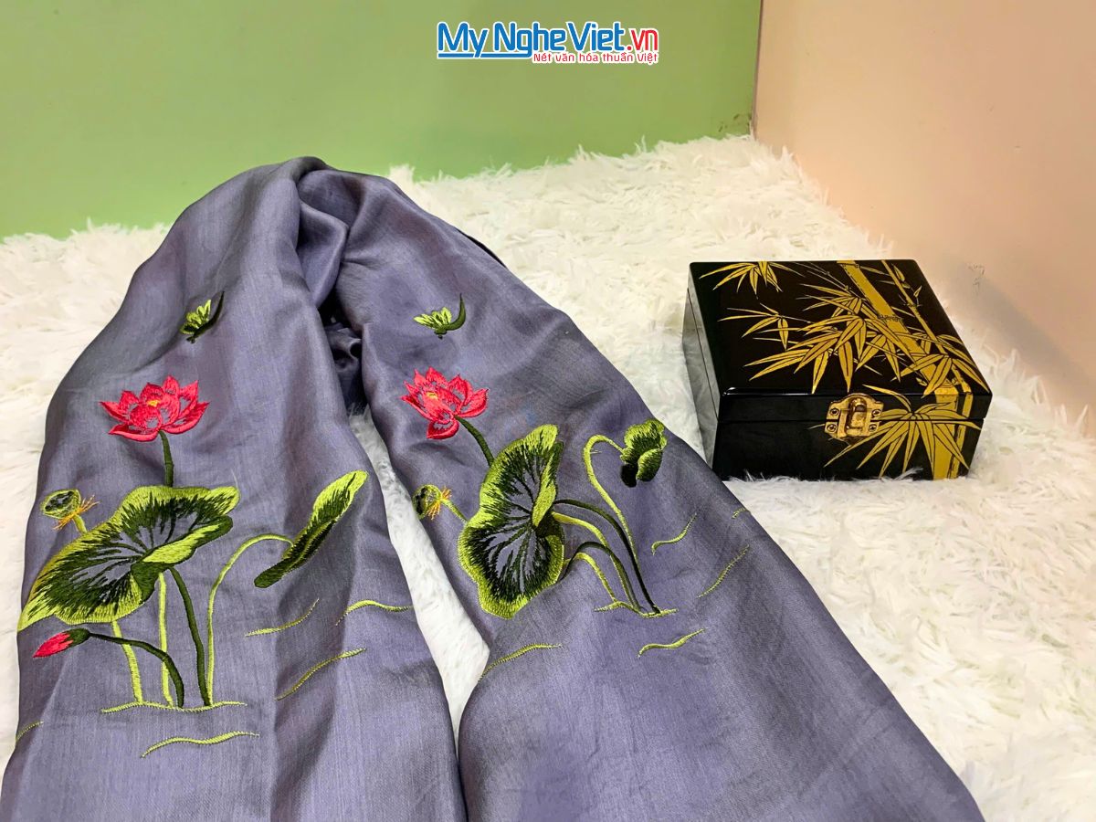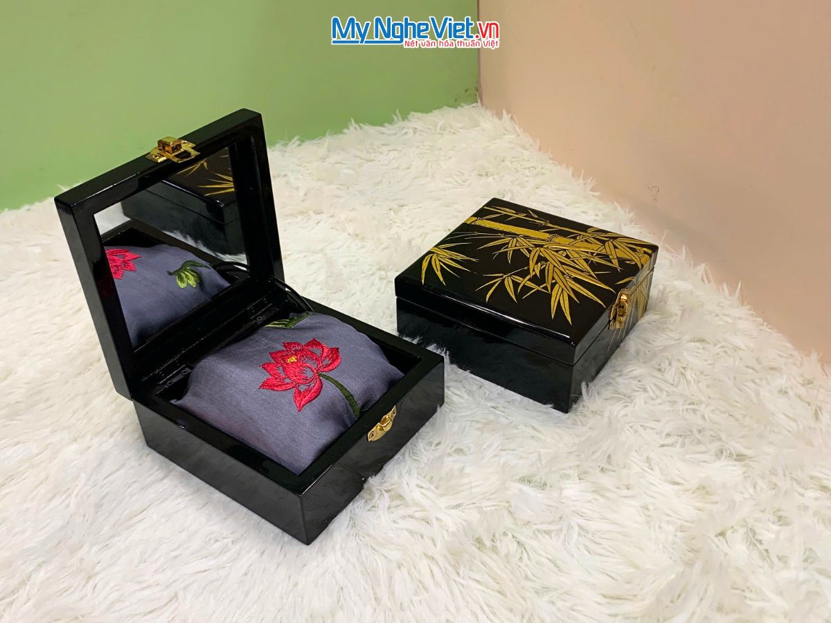 🌟Hộp sơn mài lá trúc tinh xảo gói trọn khăn lụa Hà Đông họa tiết hoa sen thêu tay mềm mại.