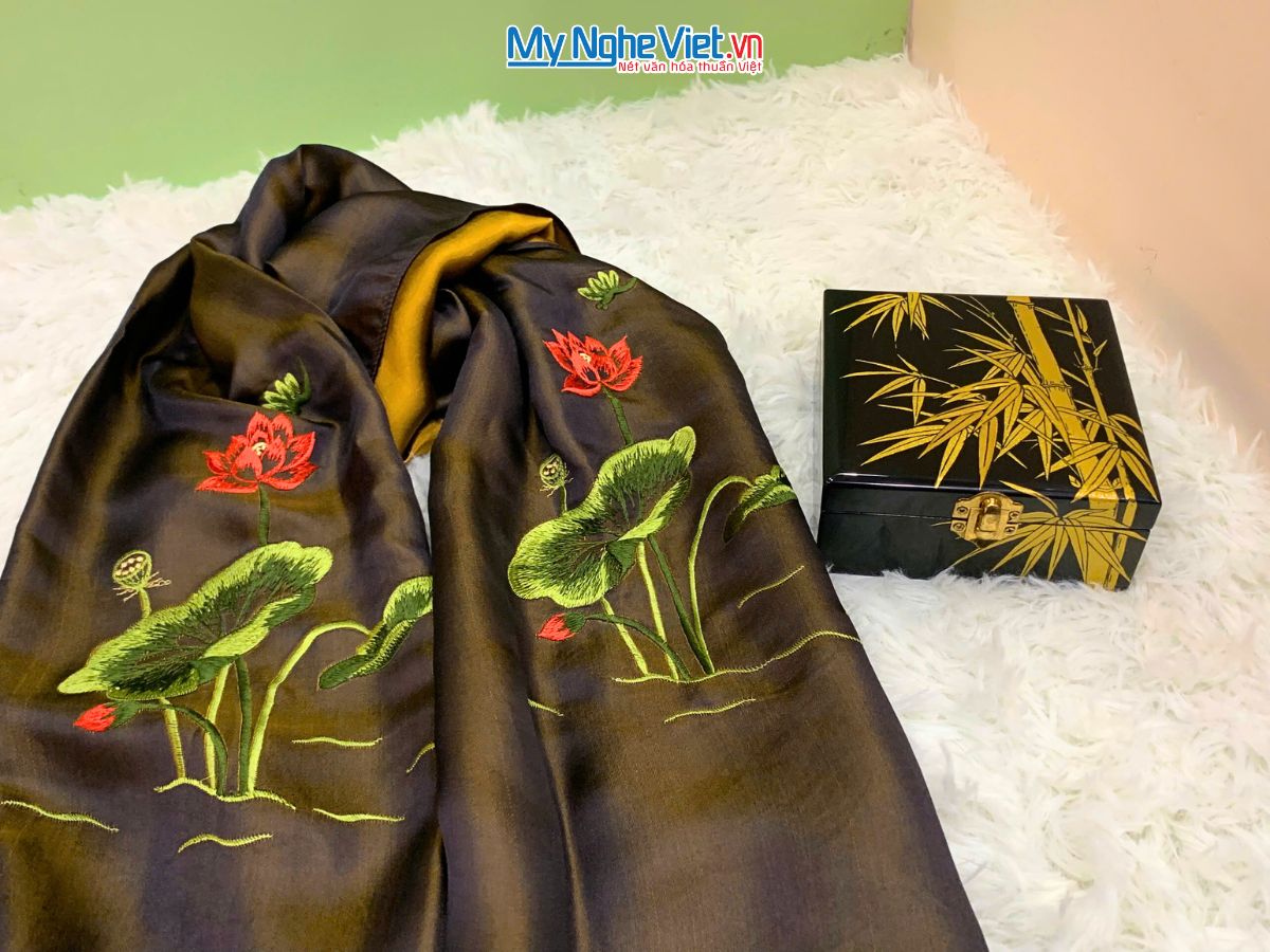 🌟Hộp sơn mài lá trúc tinh xảo gói trọn khăn lụa Hà Đông họa tiết hoa sen thêu tay mềm mại.