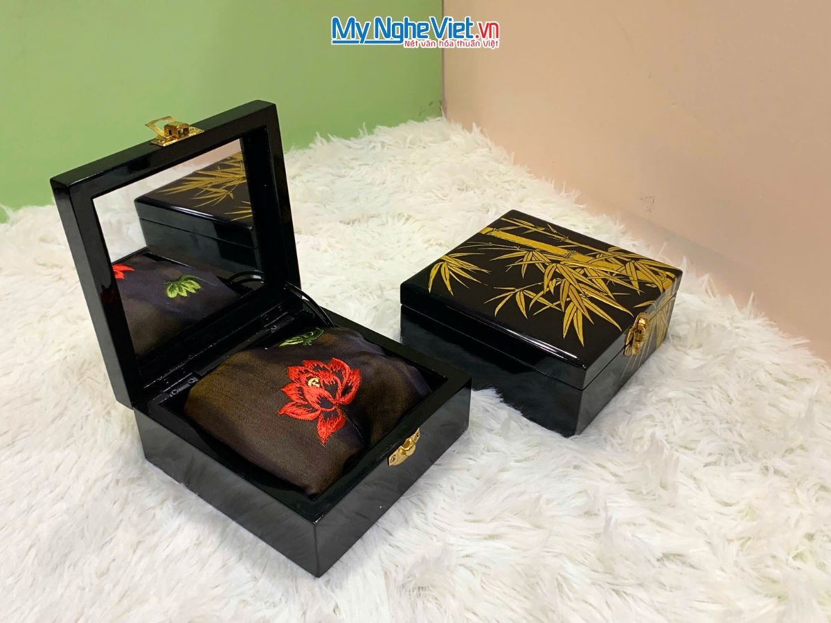 Bộ sản phẩm bao gồm: 01 hộp sơn mài và 01 khăn lụa