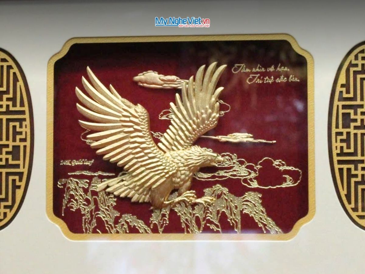 Hình ảnh đại bàng sải cánh trên nền dát vàng không chỉ mang lại vẻ đẹp uy nghi, sang trọng mà còn tượng trưng cho sự nghiệp thăng tiến, vượt qua mọi thử thách để đạt được thành công.