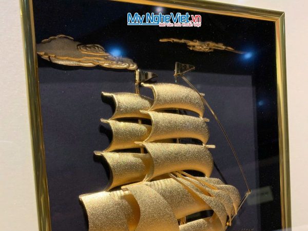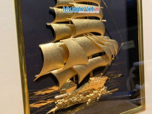 Hình ảnh con thuyền căng buồm rẽ sóng vươn khơi, được thể hiện bằng nghệ thuật dát vàng truyền thống, không chỉ mang vẻ đẹp quý phái lấp lánh mà còn gửi gắm bao hy vọng, niềm tin về một hành trình thuận lợi, mọi việc hanh thông, đại cát đại lợi.