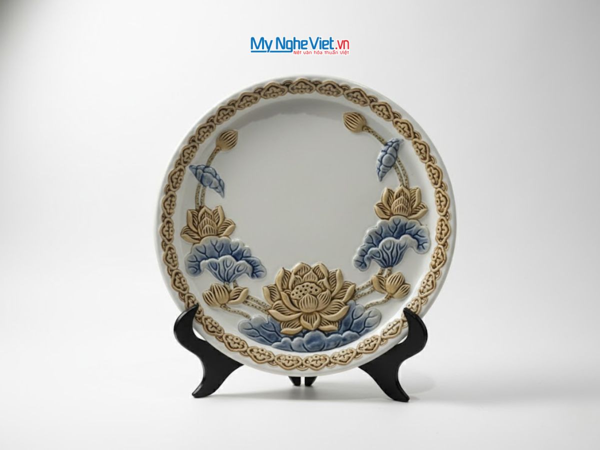 Hơn thế nữa, một chiếc tranh đĩa gốm Bát Tràng hoa sen đắp nổi là món quà tặng cao cấp, ý nghĩa trong các dịp lễ tết, khai trương hay tân gia. Món quà này không chỉ thể hiện sự trân trọng và gu thẩm mỹ tinh tế của người tặng mà còn mang giá trị văn hóa, tâm linh sâu sắc, cầu chúc sự an lành, thịnh vượng và tài lộc.